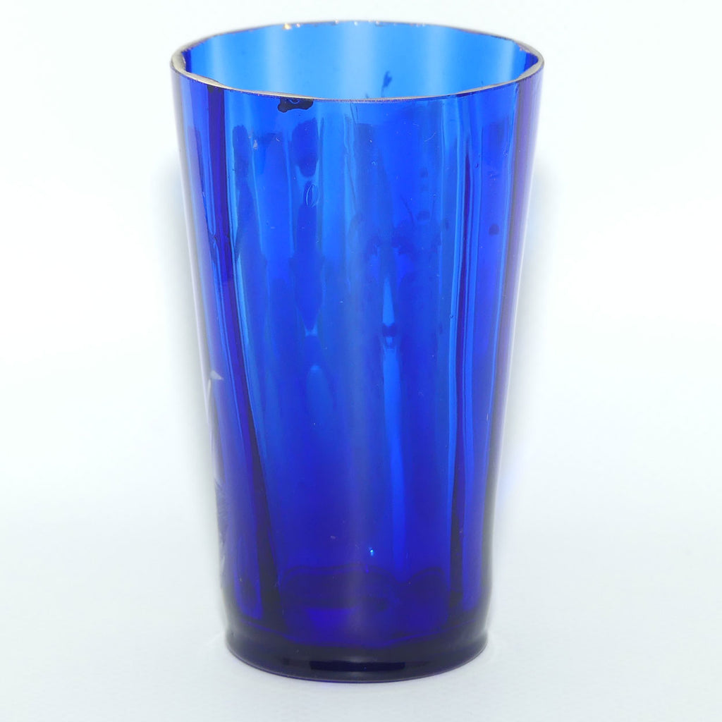 A superb Antique example in the desirable cobalt blue glass, it's authenticity and originality is confirmed by the flat sides on the inner of the tumbler. These are evidence of the item being blown by hand.