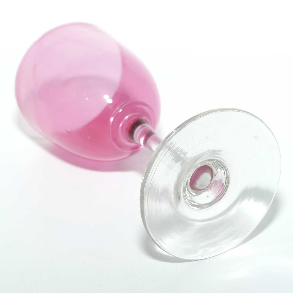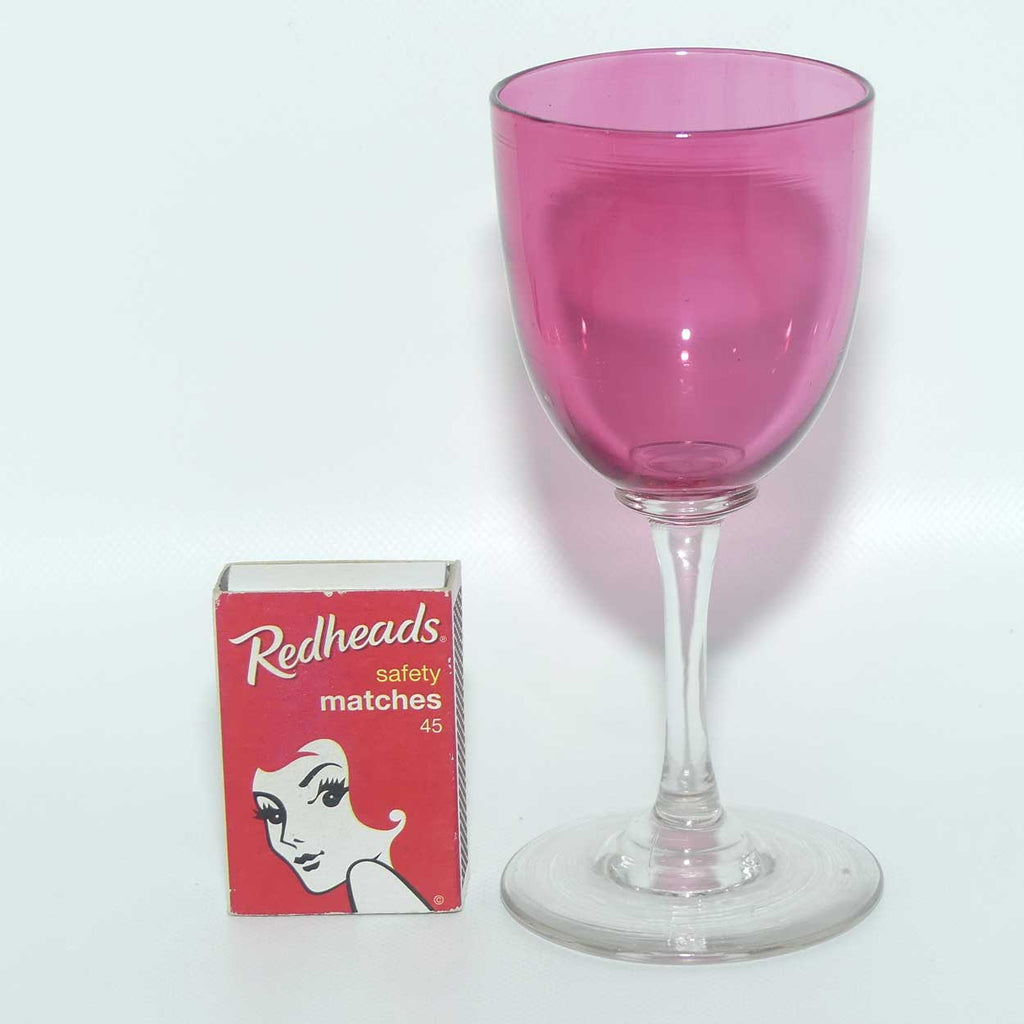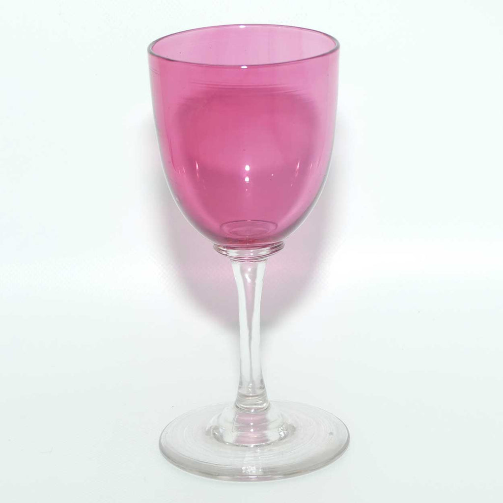 A traditional hand blown Cranberry wine glass, with a clear glass stem and foot