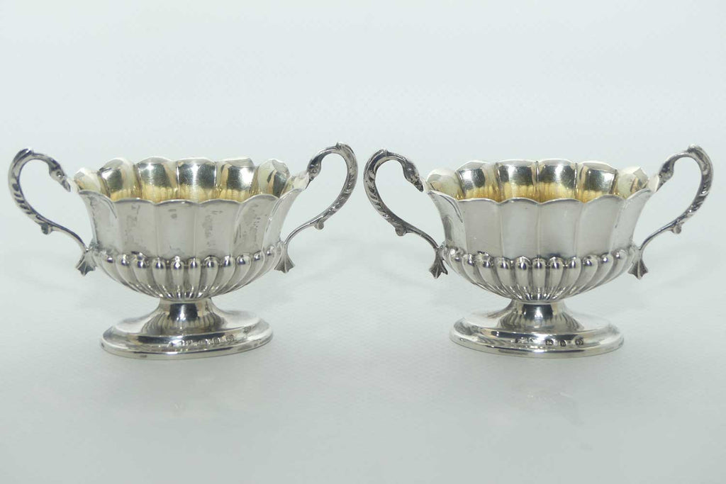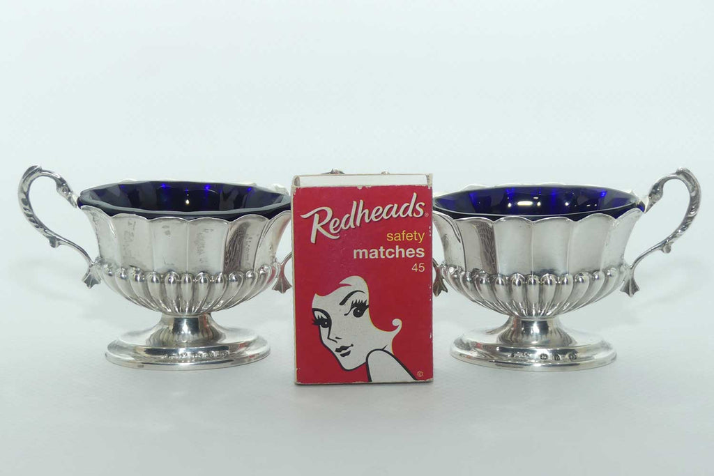 Victorian era Sterling Silver open salts in Campagna vase form with blue glass liners