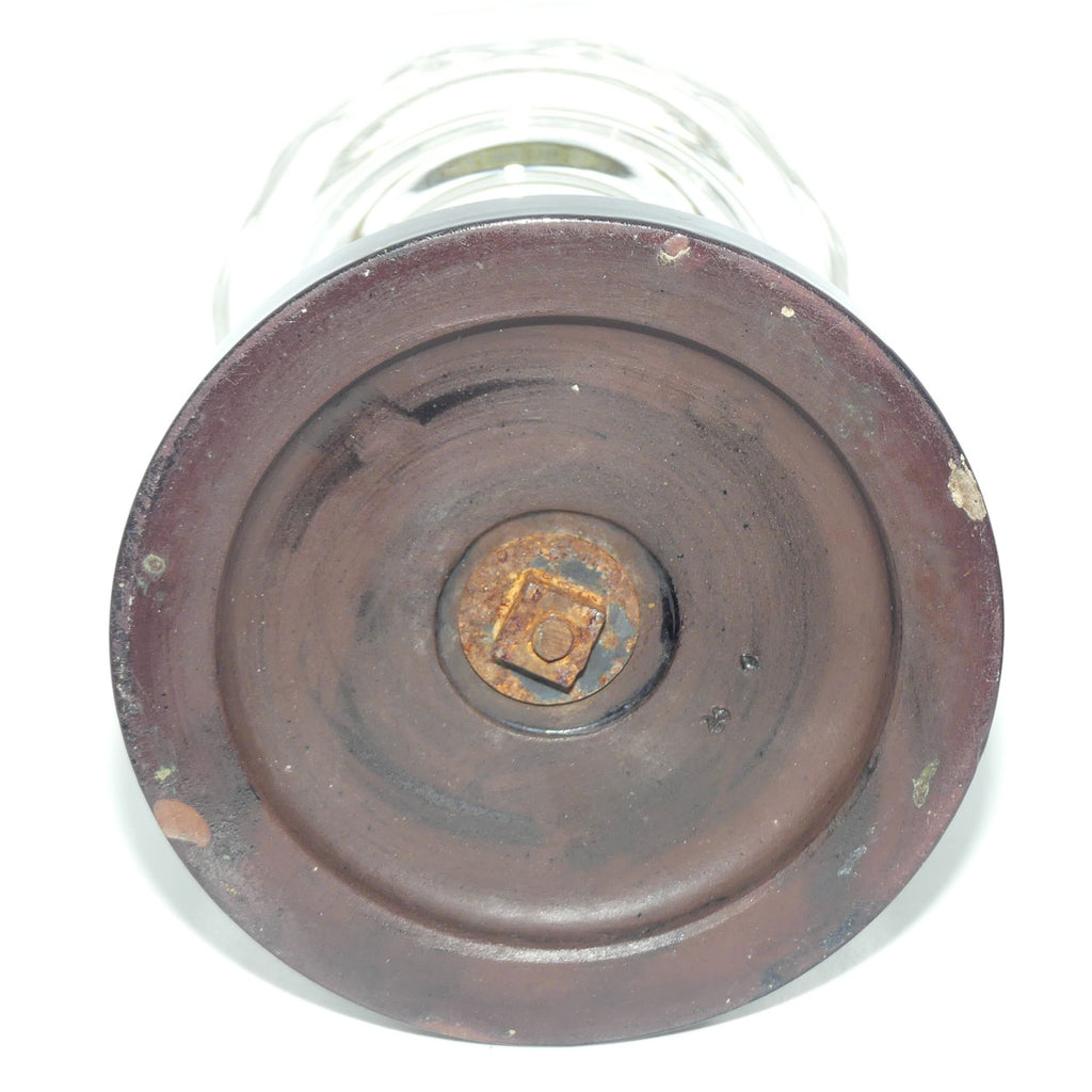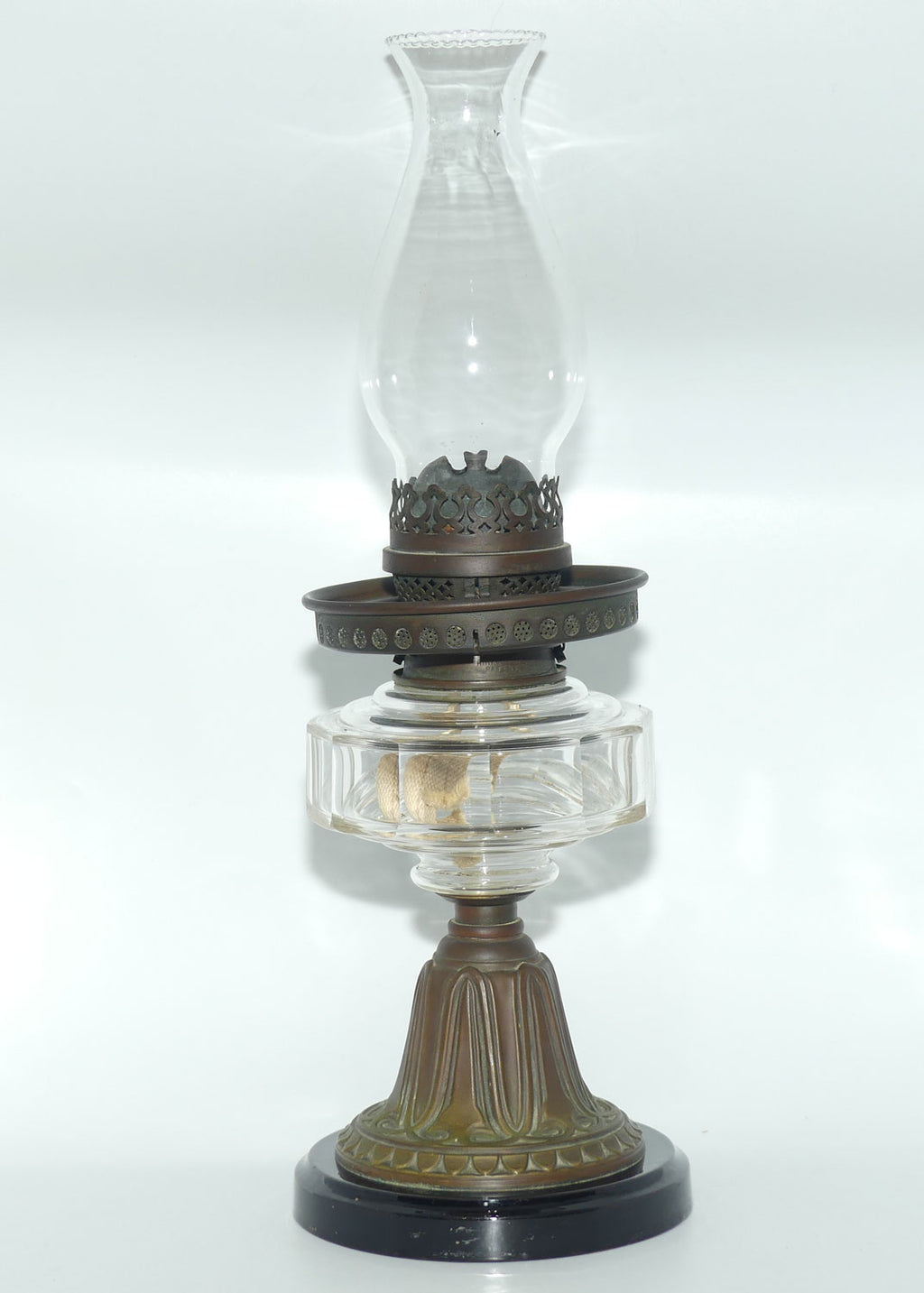 The facetted font sits atop a Brass column, which is screwed to a Japanned | Black Gloss on Terracotta base - the burner is fitted with a Hinks Duplex Patent burner + chimney, there is no shade