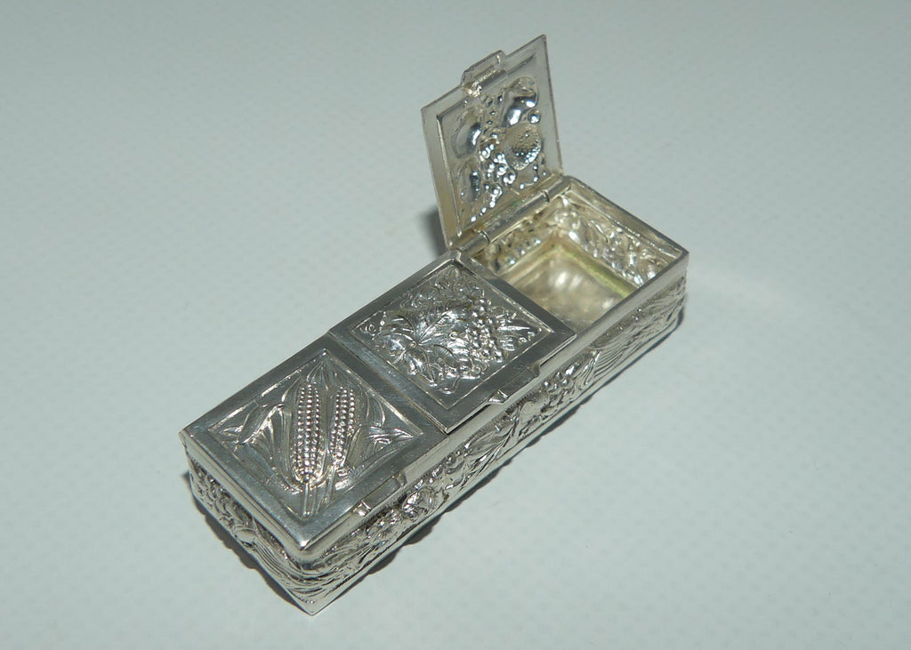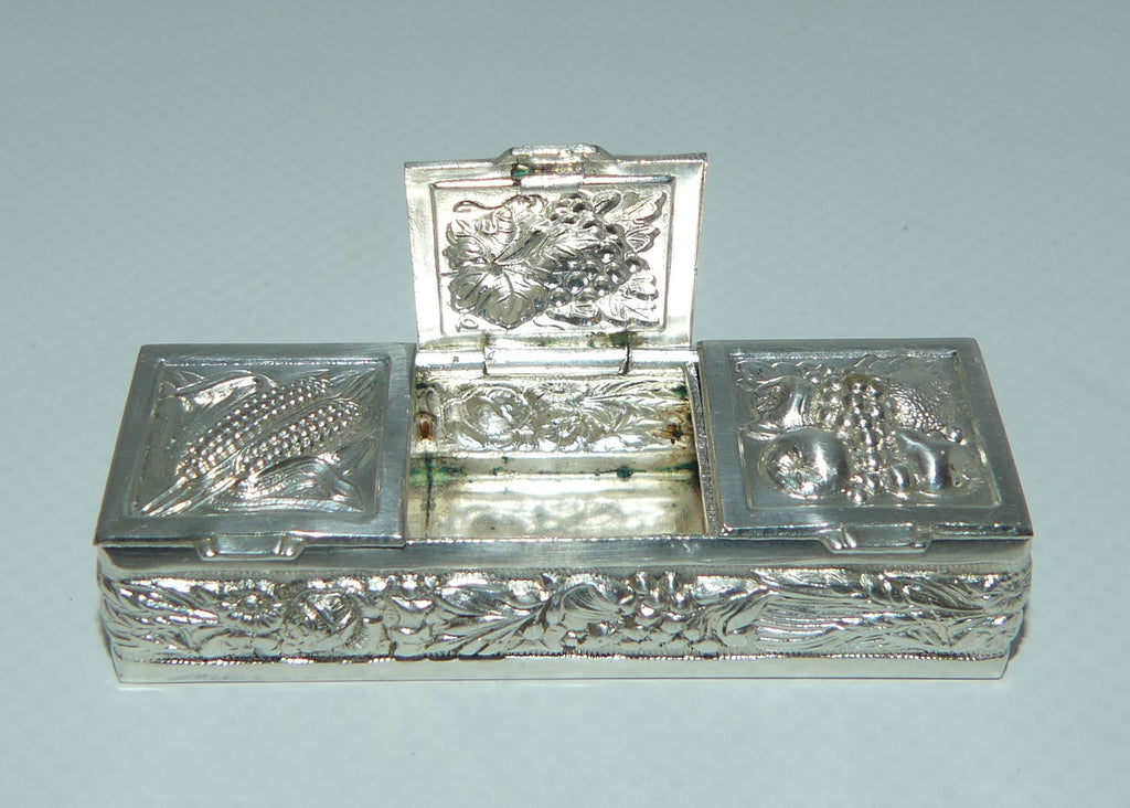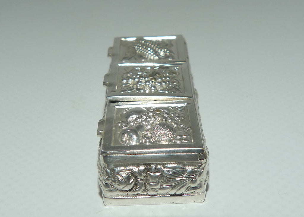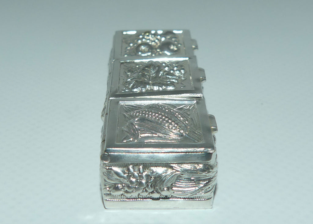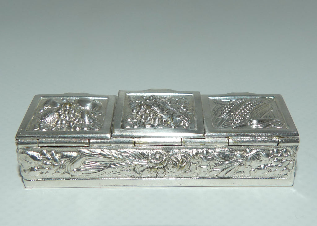 This rectangular three compartment pill box, is beautifully executed in silver plate with an autumn harvest theme in detailed repousse. One compartment depicts Corn, the next Grape and Vine, the last Fruits. Each compartment is hinged and snaps shut very firmly. Unmarked. Possibly Portuguese or Italian origin.