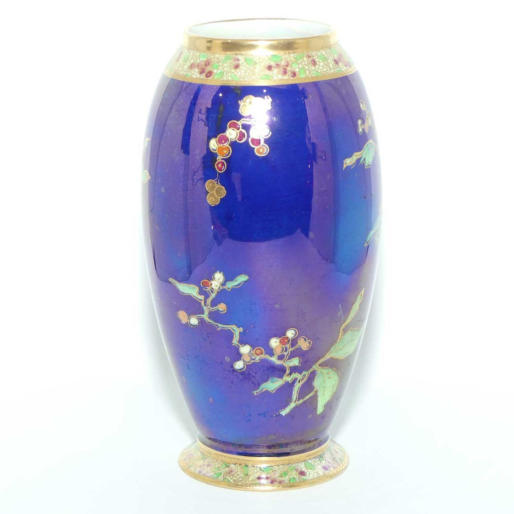 A superb footed base Carlton Ware Blue Lustre vase designed by Enoch Boulton, with two parrots in red and yellow. This vase has great depth of colour with iridescent colour changes. An early rare design, difficult to find in such good order.