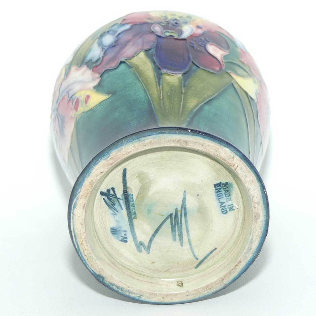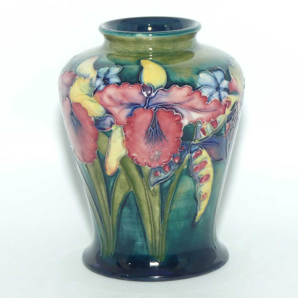 Walter Moorcroft Orchid on Light Green transition to Blue Ground tapering vase