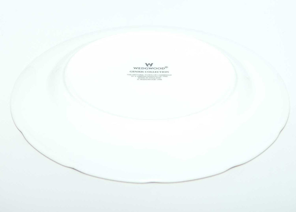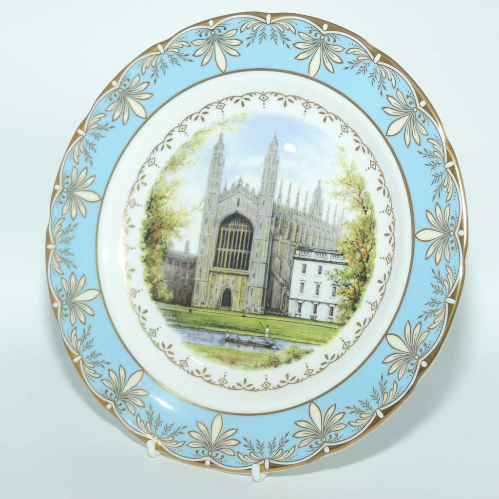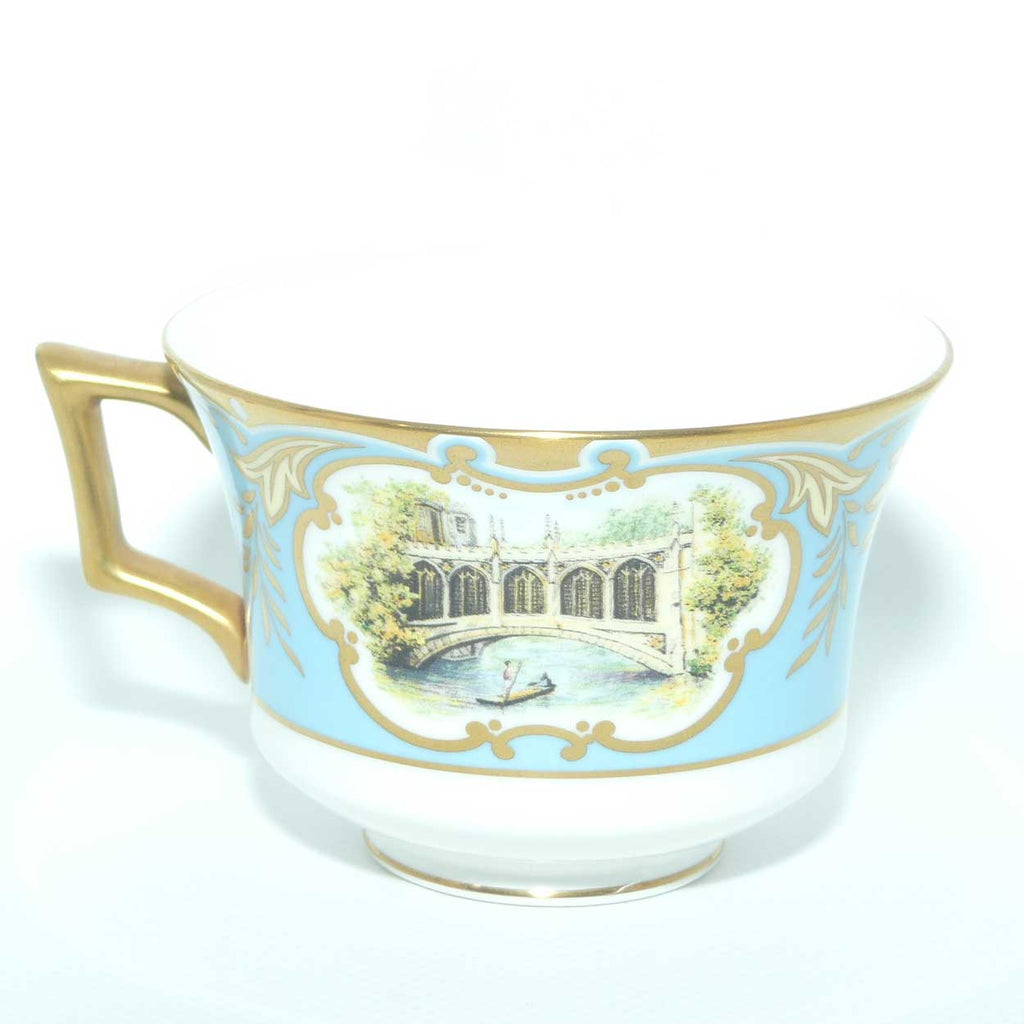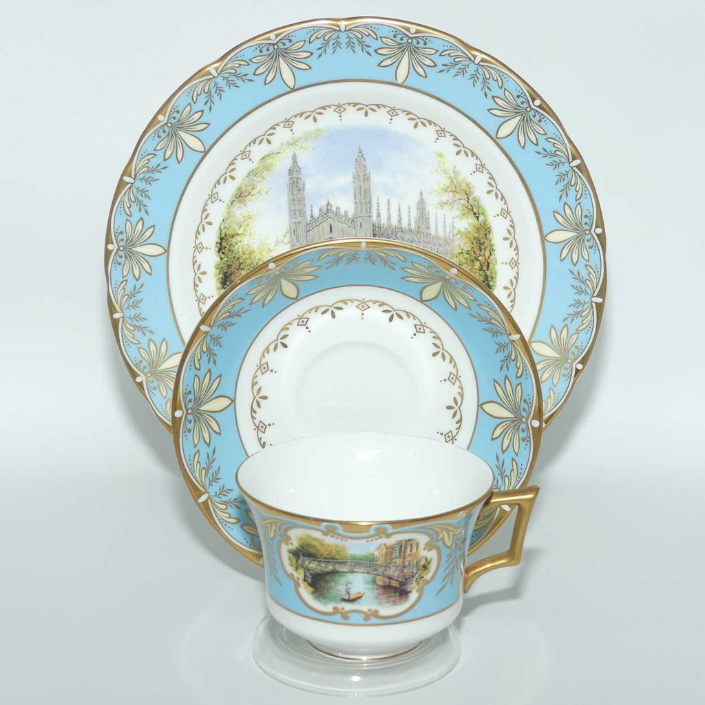 On the tea cup there are 2 scenes [front and back] which depict iconic locations in Cambridge, the saucer does not depict any scenes but matches with the Turquoise colour, and the plate has another large scene of the iconic University