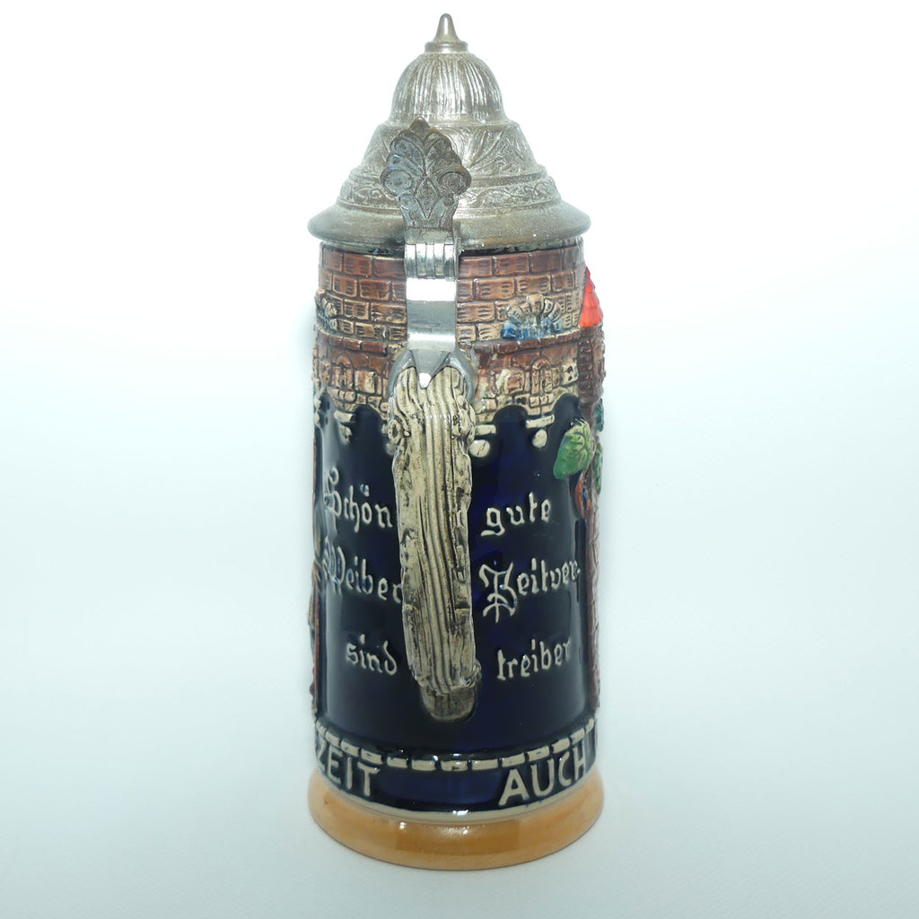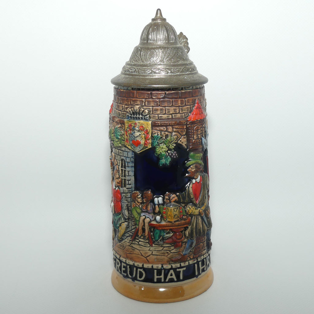 And Schöne Weiber Sind Gute Beitver Treiber which loosely translated is Beautiful women are good business drivers [there is a lady sitting on the table near the tavern in the decoration