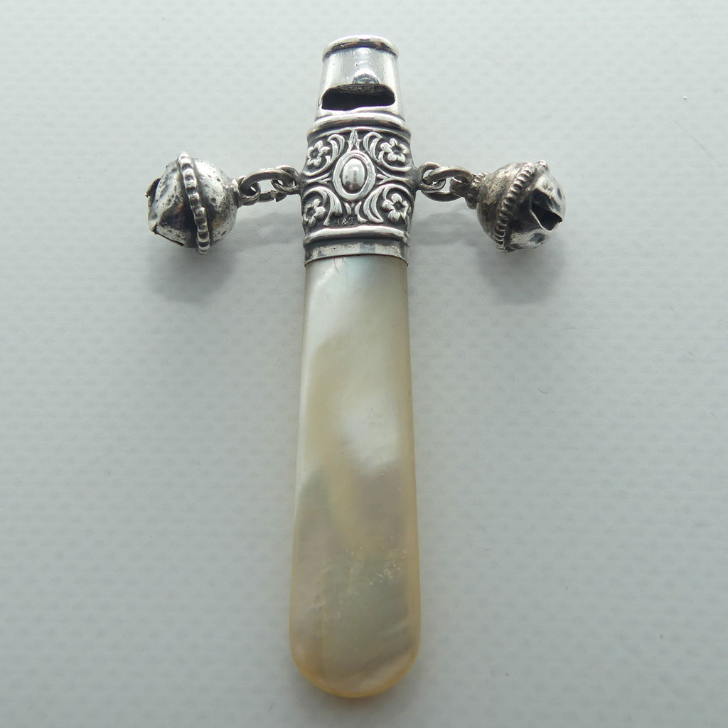 Edwardian era Sterling Silver and Mother of Pearl Baby Rattle and Whistle
