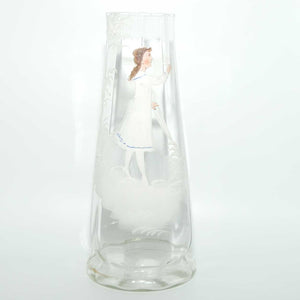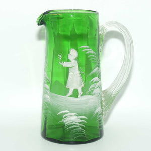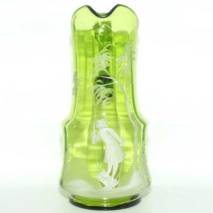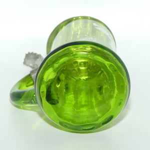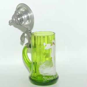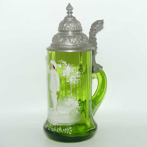 Green Mary Gregory Glass stein with pewter lid and decorated with handpainted Cavalier and the motif "Behut Dich Gott" (translated means Godspeed).