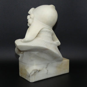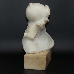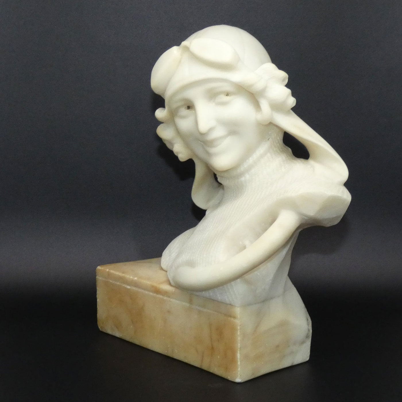 Art Deco Alabaster bust of a female race car driver, shown with leather helmet & goggles, in a thick turtleneck sweater, mounted on a rectangular sockle off-center with steering wheel across her front.