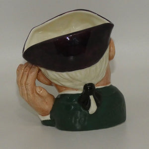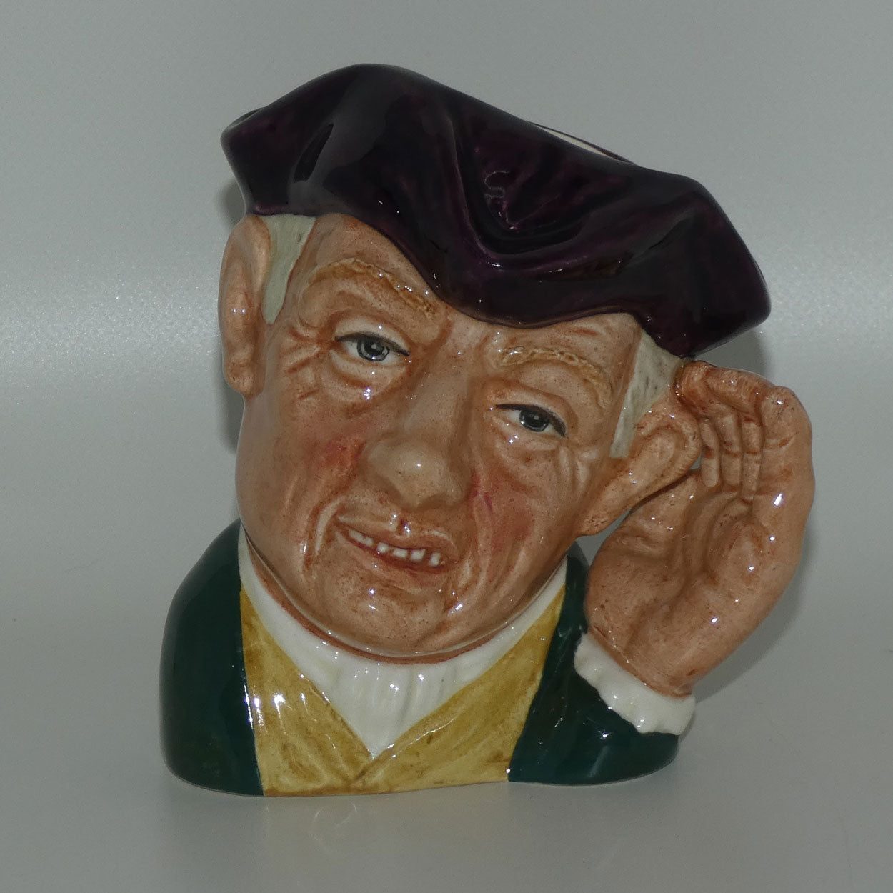 With a hand held cupped to his ear, this cockney gentleman is a comical representation of a 17th century deaf man - complete with tricorn hat. After being introduced in 1964 and discontinued relatively promptly in 1967, this jug has increased in value and is difficult to find - it is one of the key character jugs in any collection, regardless of size.