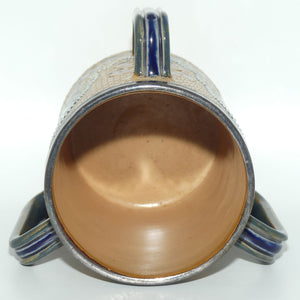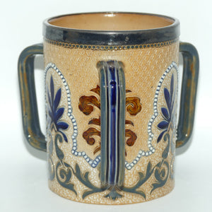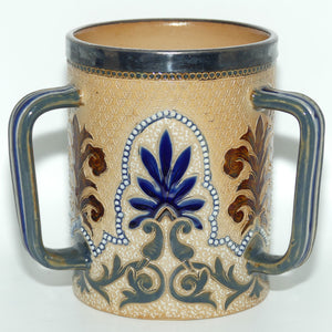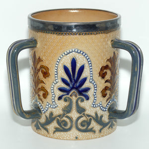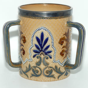 Doulton Lambeth stoneware triple handled loving cup tyg with beads, foliage and metal rim by Frank Butler (signed to base of cup)
