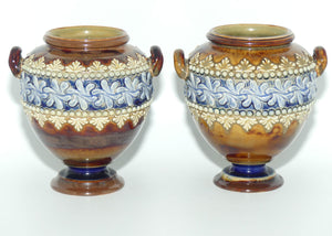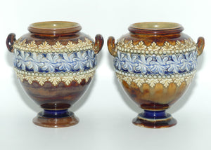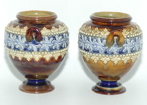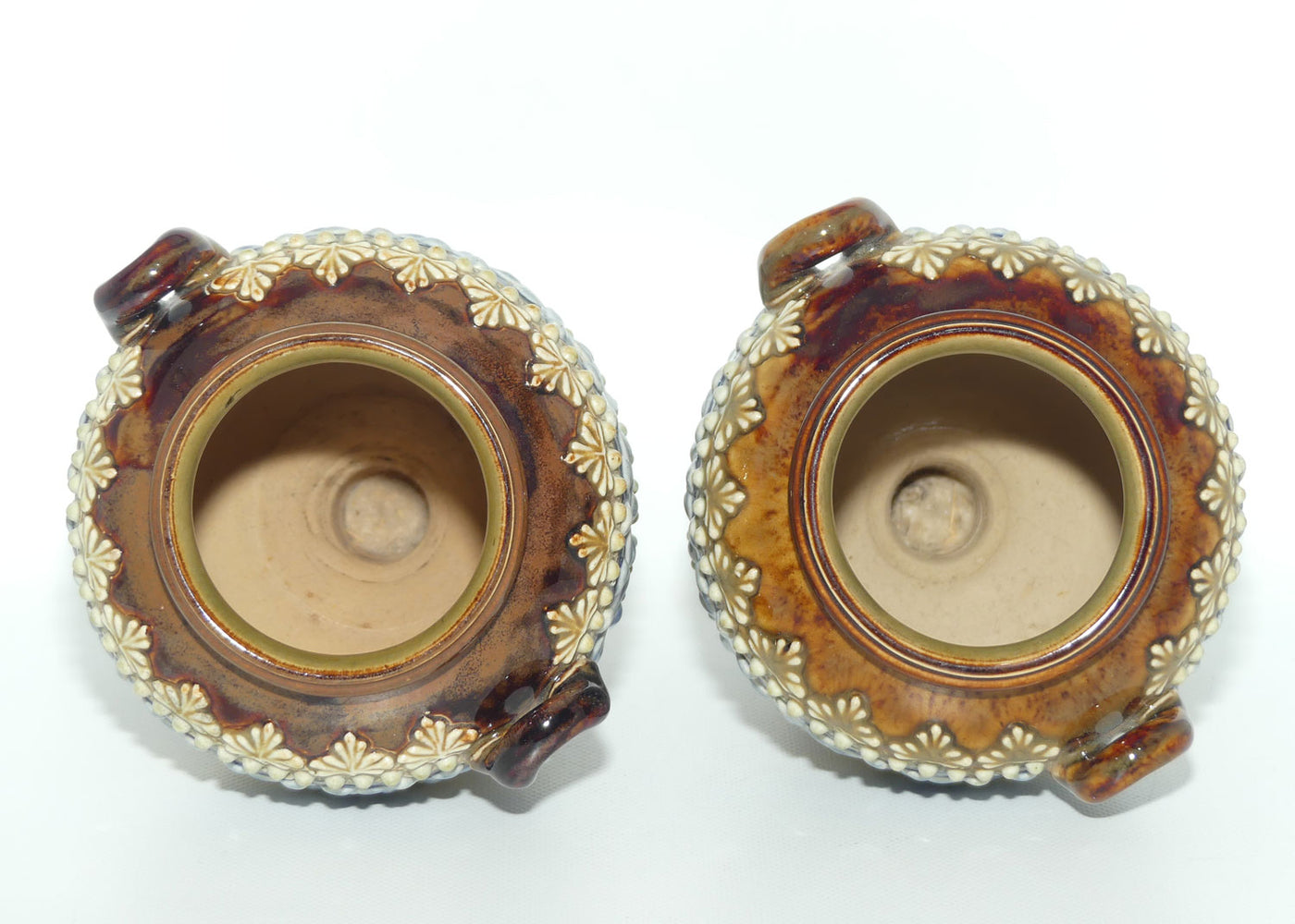 Doulton Lambeth pair of small stoneware footed urns with applied decor and beads