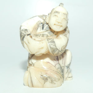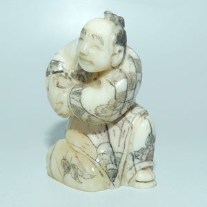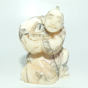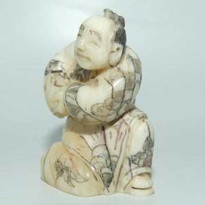A netsuke is a miniature sculpture, originating in 17th century Japan. They can be made from boxwood, Ivory, Bone and Silver. Initially a simply-carved button fastener on the cords of an inrō box, netsuke later developed into ornately sculpted objects of craftsmanship.