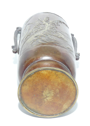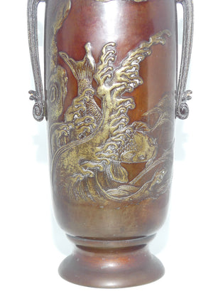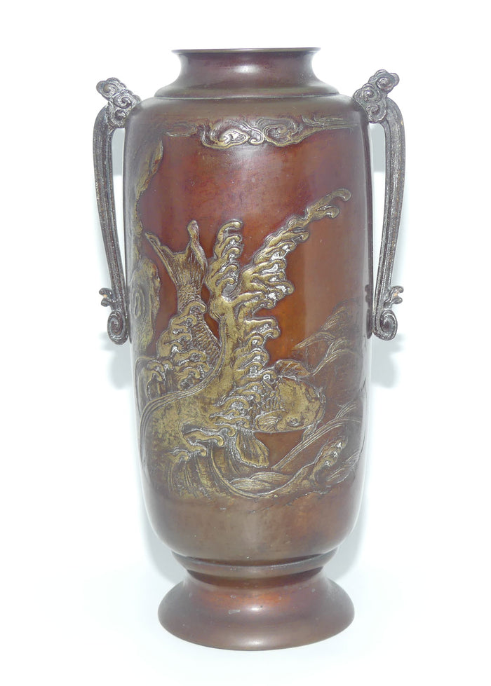 There are 2 different scenes on the vase - Koi within reeds and Koi swimming vertically within a depiction of water. Chinese tradition tells of carp (koi) attempting to swim upstream at the Dragon Gate rapids, impeded by demons who increased the height of the waterfall. After considerable struggle, the carp which succeeded were turned into golden dragons. The fish consequently became an emblem of perseverance and success, and of a destiny fulfilled. The scene on these vases evokes the legend, and may be related to a samurai’s coming-of-age ceremony (genpuku) when carp streamers called koinobori are flown on poles. In Japan, koi are particularly associated with the steadfastness and determination of the samurai.