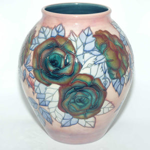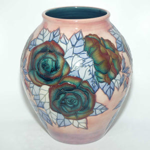 My understanding [confirmed at page197, Atterbury] is that this design was by Sally Tuffin and released during 1992 and each design was individually painted by Wendy Mason, in varying colour palettes. Signed to base by John Moorcroft and noted underglaze ST DES [Sally Tuffin Designer] and W PINXIT 5 -3 1992 No 6. My understanding is that this vase would be an almost "once off" colour variation.