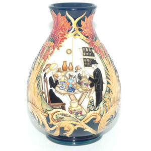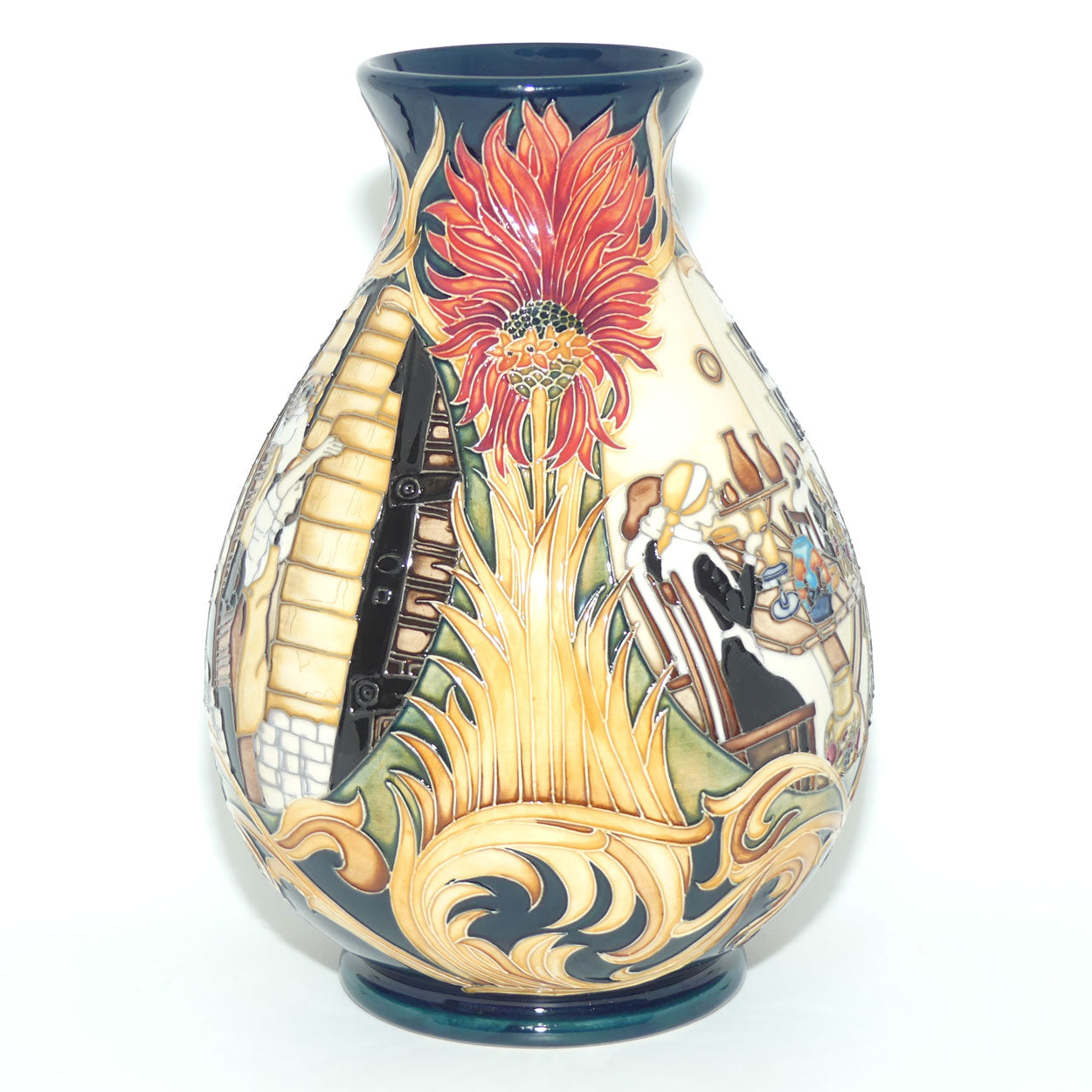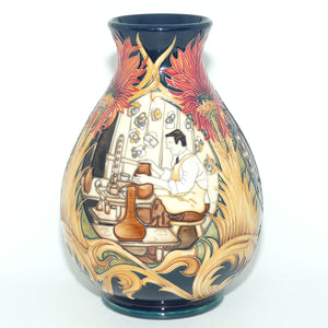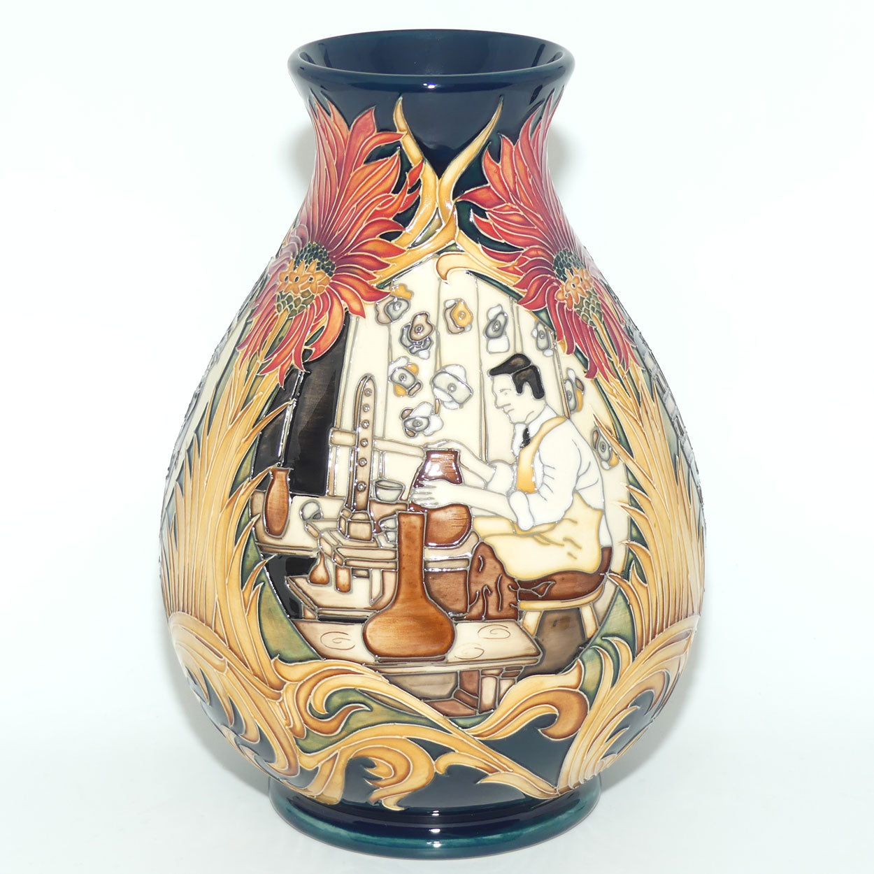 About William at Work: this design by the supremely talented Paul Hilditch shows the master potter, William Moorcroft, in his various roles at W Moorcroft Ltd. One panel shows William Moorcroft "at work" creating art pottery, one panel shows William "at work" in the painting and tubelining department in his role as works manager, and the final panel shows William "at work" placing items in the kilns. Each panel is framed by the iconic and instantly recognizable William Moorcroft Cornflower Florian pattern - revered by collectors of Art Pottery worldwide. A masterful piece showing the multiple roles that William Moorcroft had at his art pottery works in Burslem, Stoke on Trent, England.