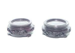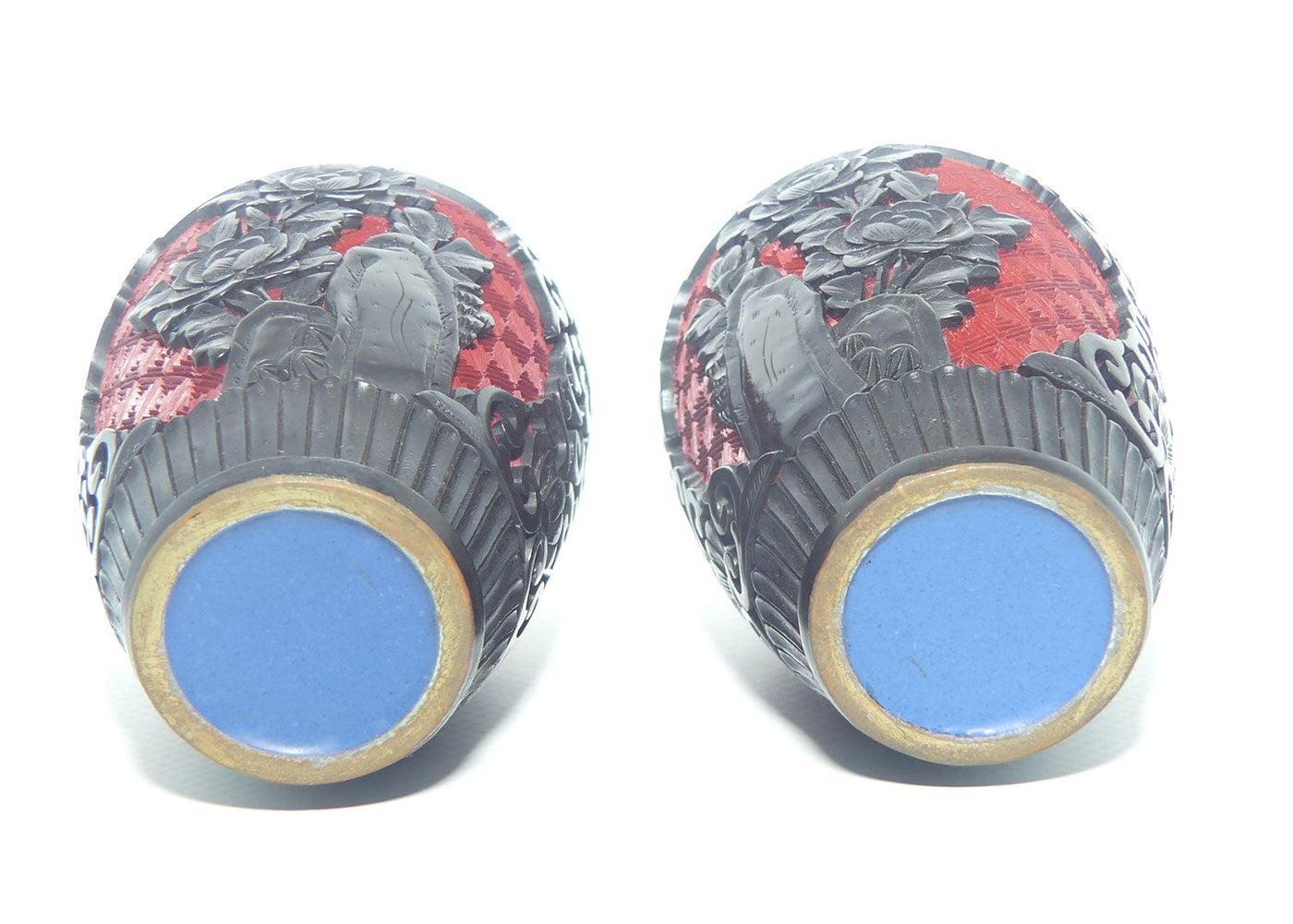 Pair of Vintage Chinese Hand Carved Cinnabar vases on Wooden stands