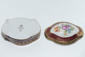 The trinket box has a lovely casket style shape and 4 small shaped feet. The lid is decorated with a Floral spray and a finely detailed gilt edge