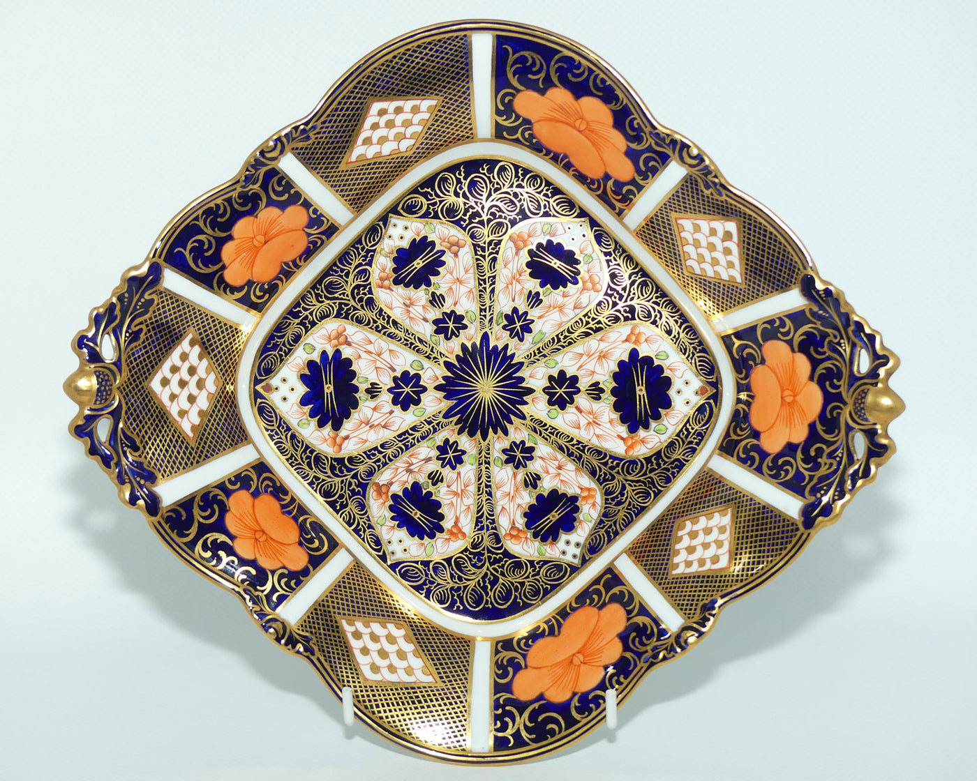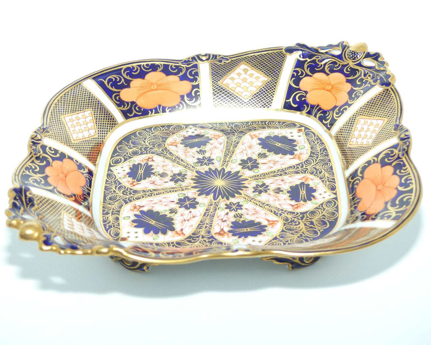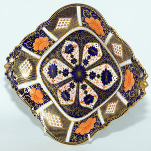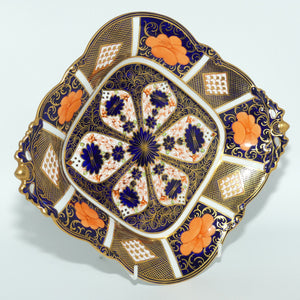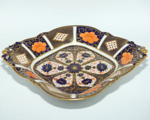 Royal Crown Derby Old Imari 1128 diamond shape acorn handled dish with tiny feet