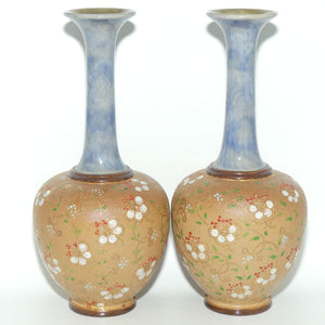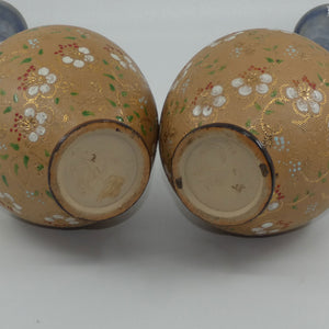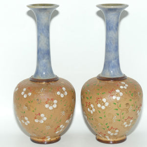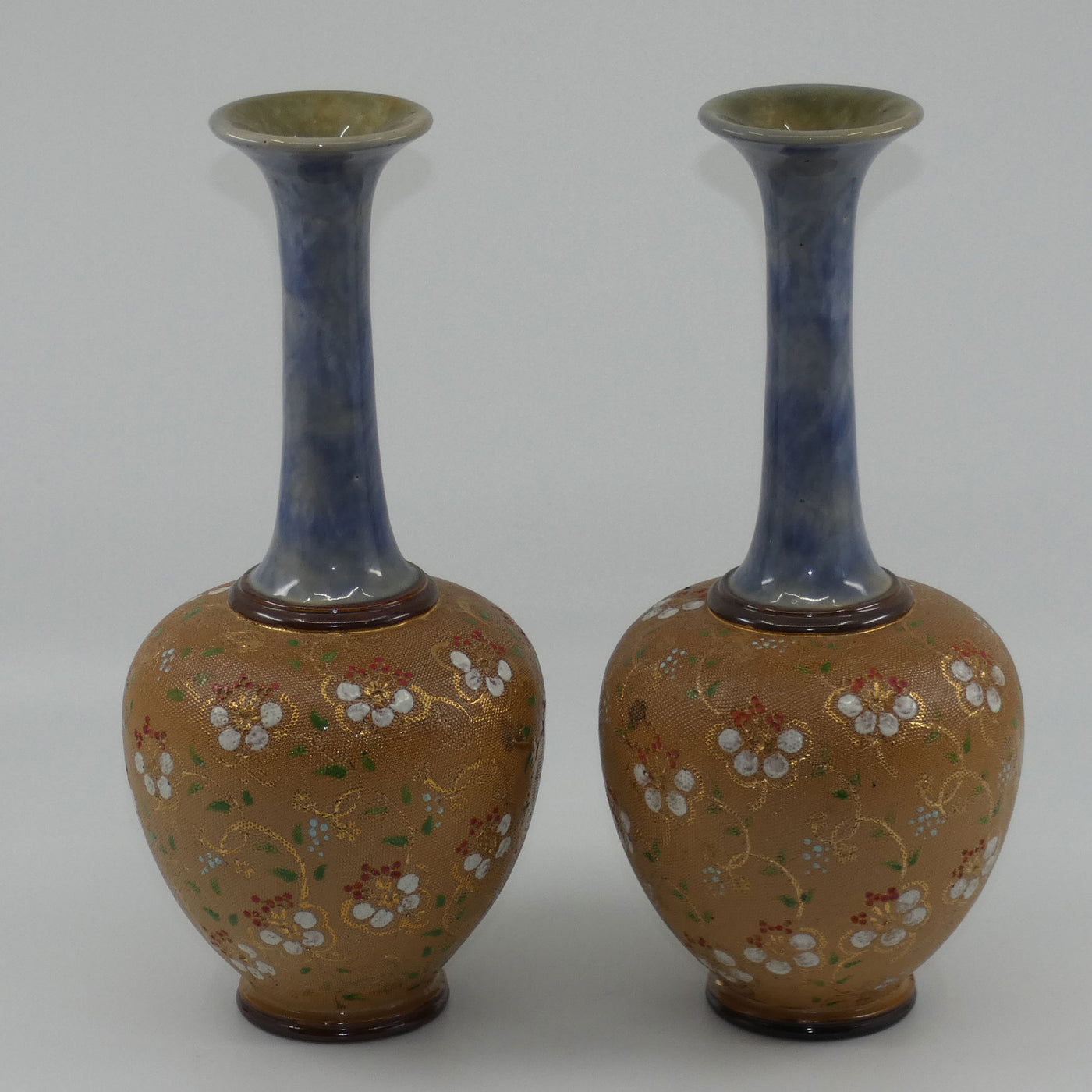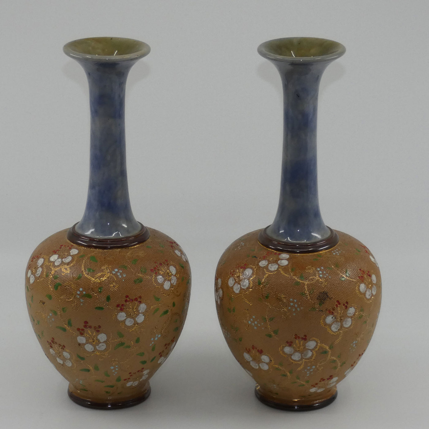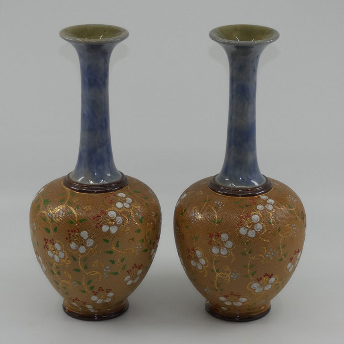 Royal Doulton stoneware pair of narrowneck bulbous vases with red, white & green enamelling and gilt highlights (stamped 8420)