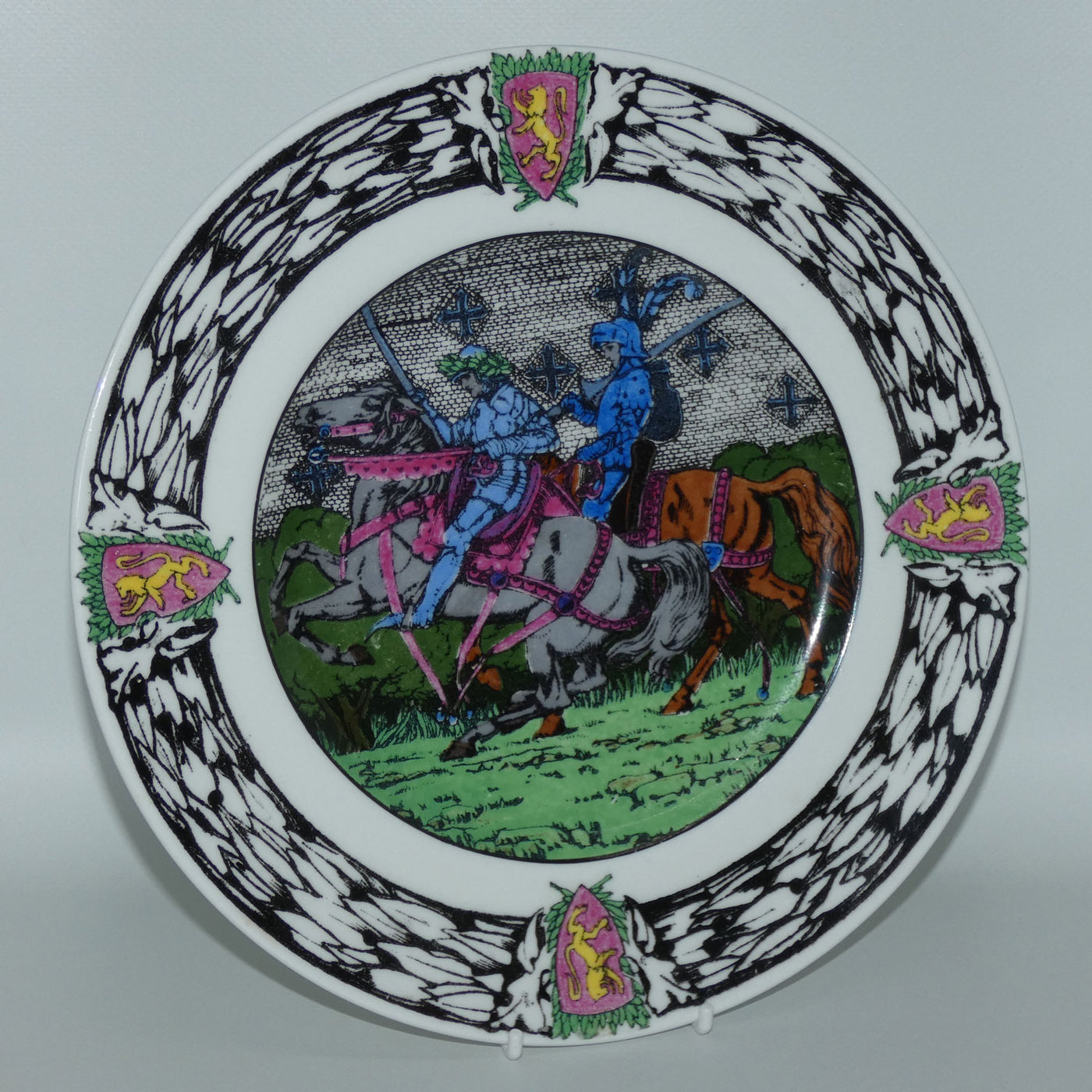 Scene 1: Two knights, one in the foreground on a rearing horse, the other with his lance over his shoulder