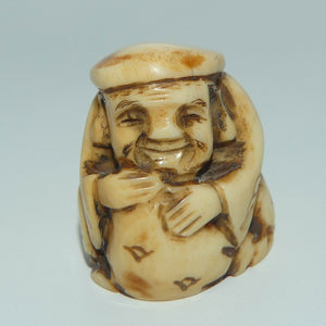 This item comes from a collection of Netsuke, and fit well within the collection, however it is a 1960s or 1970s era piece made from a resin [some call this French Ivory]. It is a nice display piece if you have always wanted to own an Ivory Netsuke - but not wanted to spend the Ivory price!